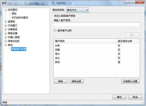 7.客服端新增--【系统-选项-其他-客服离开设置】增加自定义客服离开原因选项设置功能.