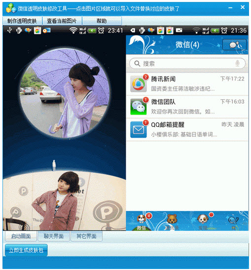 本软件实现了用户用自己喜欢的图片来装扮。超酷的微信皮肤只需轻点击鼠标就可以轻松实现。可以在实现微信透明皮肤或流行明星皮肤或自己像片的艺术皮肤。要想拥有一个个性化十足的微信,就快来试试这个工具吧。本软件的皮肤包由电脑生成并在android手机上安装即可用。