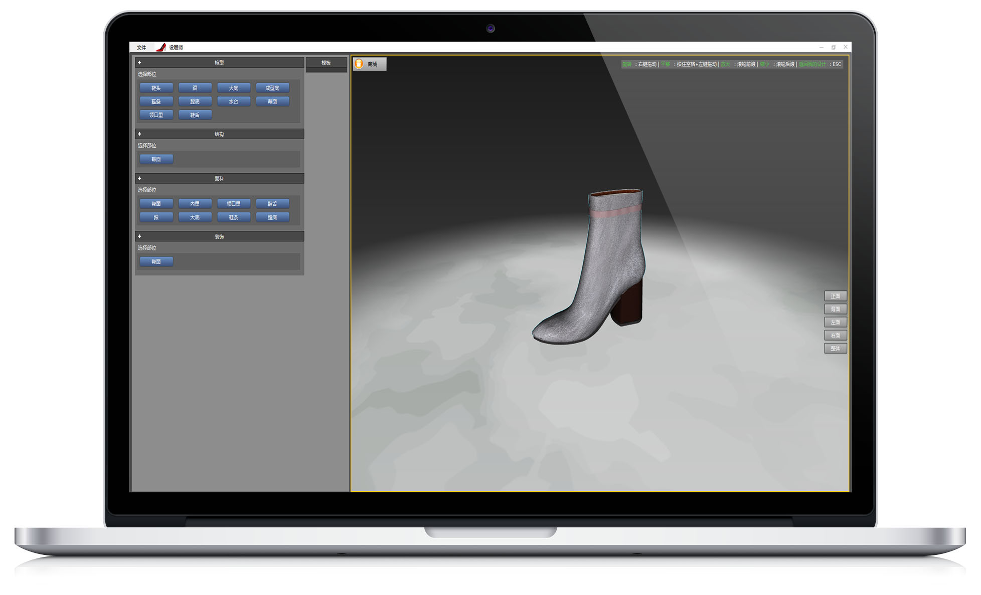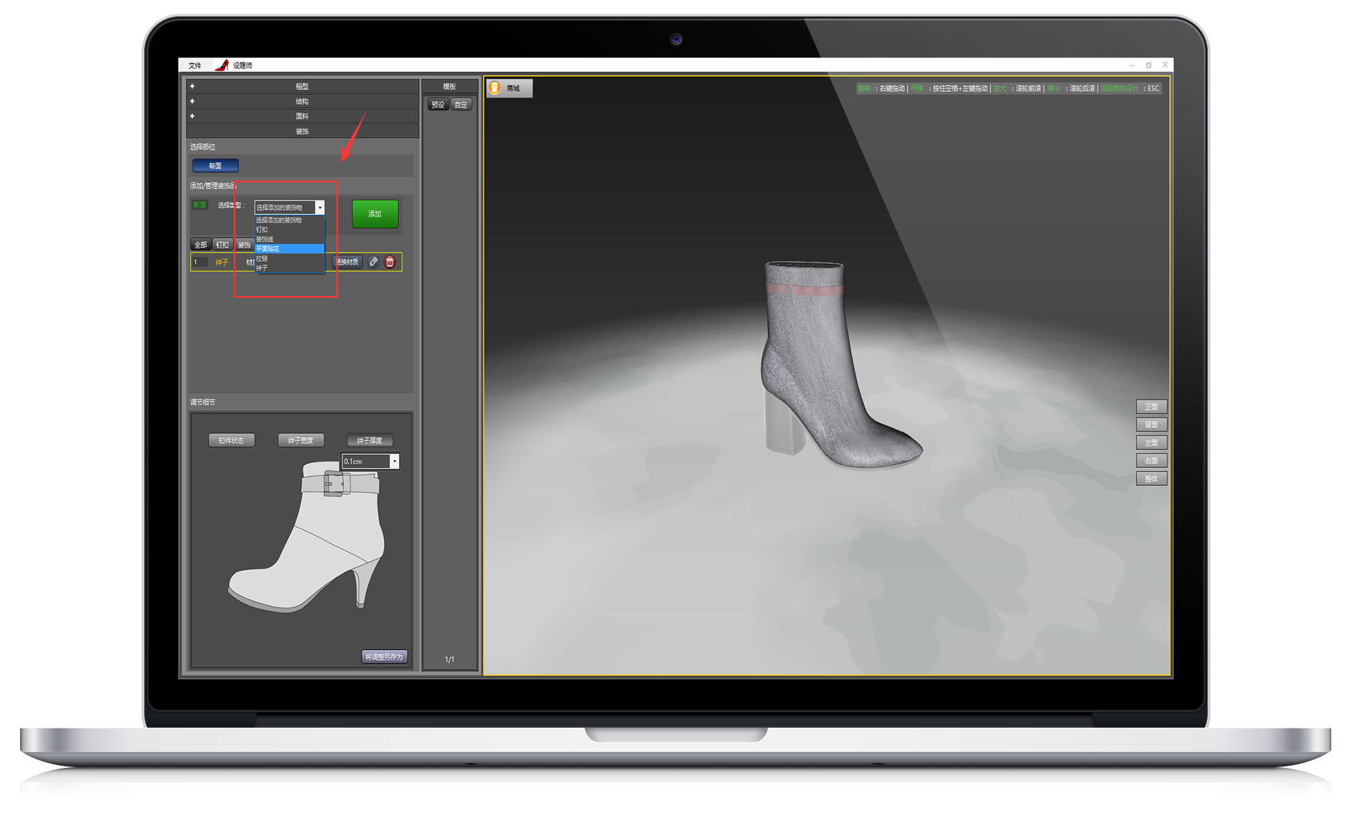 全新后的软件中,装饰是一项非常大的亮点,众所周知,鞋子的帮面上可以添加各种不同的装饰来增添美感,设屐师将此功能加入在软件中,让软件的自由度更高,模型更真实,更多元化,如下图三红框内可以对鞋子的帮面添加各式各样的不同装饰品: