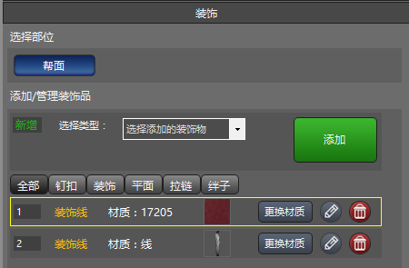 如果,某一根线条没有把鞋面裁断成两个独立的部位,则这根线条在“装饰”面板中可以看到,如下图: