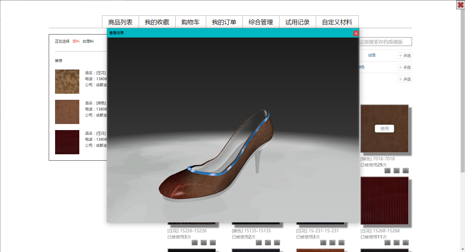 点击“使用”按钮,则会显示当前选择面料的预览效果图,如果需要更换其他面料,关闭预览效果窗口,重新选择其他面料即可。