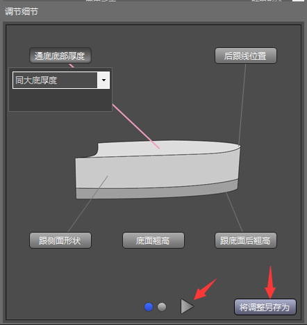点击楦型外观调整界面最下部的“造型调整”区域,打开细节调整界面,如下图所示: