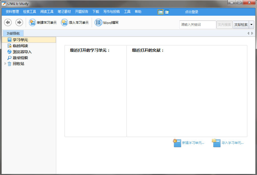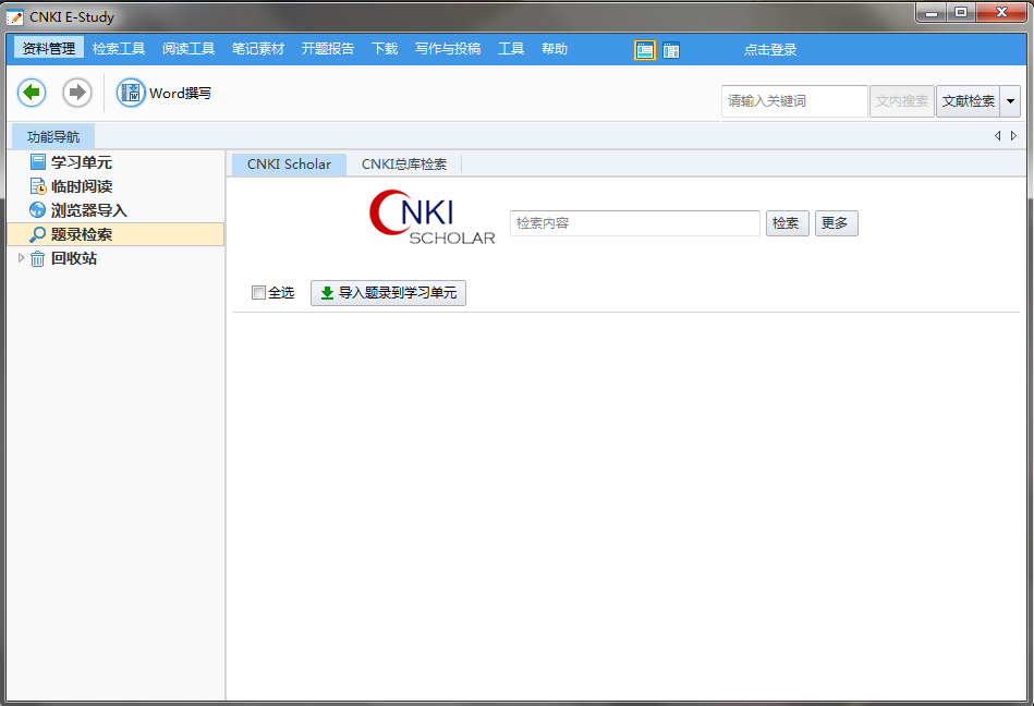 支持CNKI学术总库检索、CNKI Scholar检索等,将检索到的文献信息直接导入到学习单元中;根据用户设置的帐号信息,自动下载全文,不需要登录相应的数据库系统。