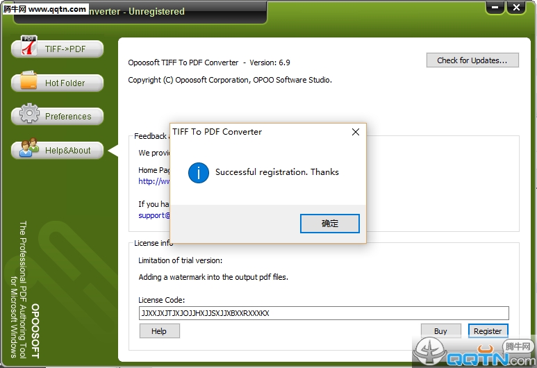 TIFF转PDF工具OpooSoft TIFF To PDF Converter是一款十分强大的PDF格式转换工具,能够批量将图片文件TIFF格式转为便携式文档文件PDF,十分好用。软件输入注册码即可破解!