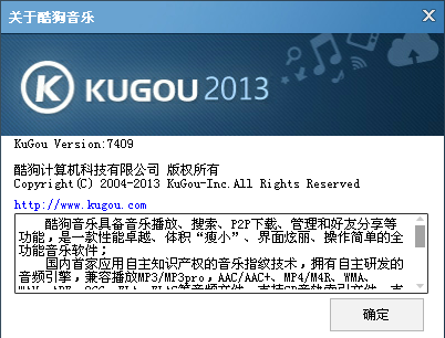 本安装包来源于官方,提供的是2012版免费下载,版本号为7409,查看“关于酷狗音乐”,发现却是写的酷狗2013,原因可能在于酷狗2012旧版不支持使用了,会自动升级到酷狗2013的,但使用起来无多大区别。