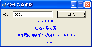 开启软件,输入QQ号码,点击查询按钮即可,例如输入10001,查询结果显示QQ姓名为马化腾。