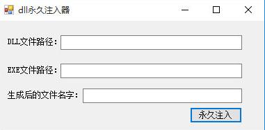 dll永久注入器是一款好用的dll注入工具,软件使用方便,只需要输入dll文件路径,exe文件路径,生成后的文件名字即可注入生成,需要的朋友欢迎下载使用。