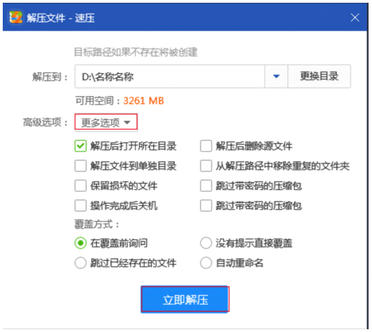 在弹出的窗口中,我们就可以进行压缩文件的解压操作了。可以直接点击立即解压按钮进行快速解压,也可以在高级选项中进行更多的选项操作,再进行文件的解压。