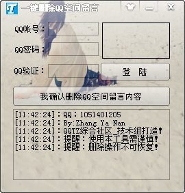 qqtz技术组开发的一键删除QQ工具,登陆QQ后,即可删除QQ空间的全部留言,删除后,全部留言都不可恢复,请慎用。