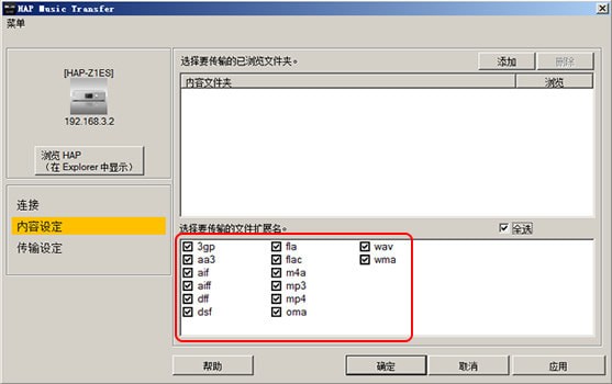 除了常用的文件格式(如)外,HAP Music Transfer还允许传输非压缩、高解析音频文件,如192kHz/24bit wav文件或DSD(Direct Stream Digital)文件格式。
