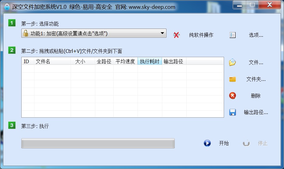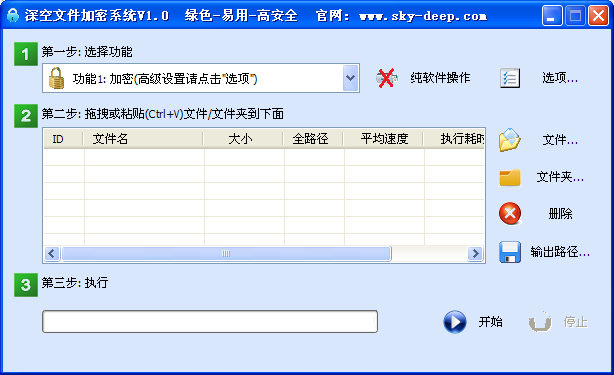 深空文件加密系统加密只需要三步,首先选择加密功能,有6种加密功能任你选,其次将需要加密的文件或文件文件夹放入到加密列表中,最后点击开始加密便可执行。