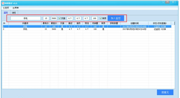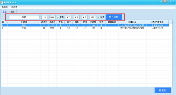 为用户实时监控有优惠券的商品,为广大购物的用户提供快捷、便捷、实惠的软件.用户只要打开软件,输入自己想要的寻找商品的关键词,设置条件后软件会自动为用户寻找商品,并且会实时更新有关的商品.同时用户双击任务就会进去商品展示的页面,用户就可以寻找自己想要的商品。