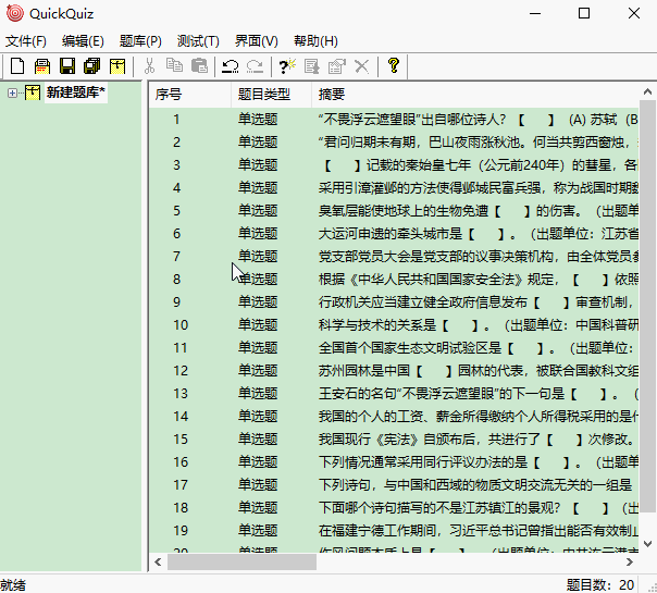 1.根据文本文档或word文档(需要预先自行安装Office套件,否则无法在本软件中直接打开)实现题库生成与编辑,现支持单选、多选、判断、填空、简答五类题目生成,另外支持题目组(即大题套小题)和基于以上五类题目的自定义题目类型(分类便于学习,例如“简答”和“论述”的区别)。