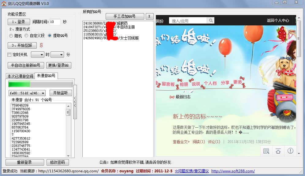 剑儿QQ空间漫游器是一款QQ空间互踩软件,通过自动访问他人空间换取回访帮助你吸引提升!