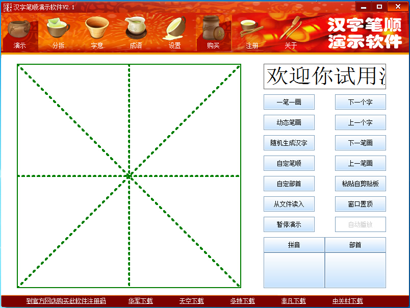 笔顺软件,汉字笔顺软件破解版,汉字笔顺演示软件破解版是一款模拟小学生使用的田字格书写汉字的工具,帮助小学生知道汉子笔画的顺序,从而学习正确的写字方法,是一款非常好用的学前软件。