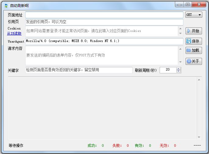 网页自动刷新工具是一个简易的自动刷新网页工具,用于按照指定的设置反复地刷新间隔,并通过检测关键字来确定刷新是否正确。