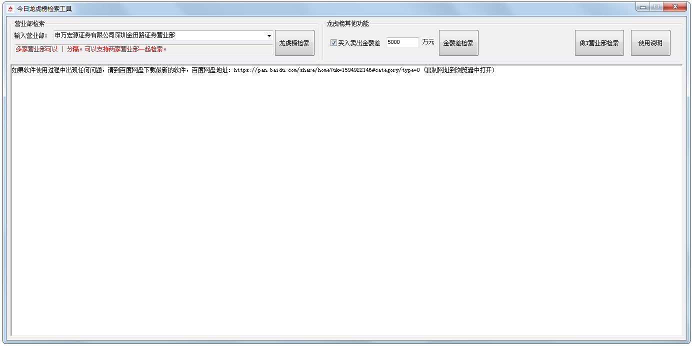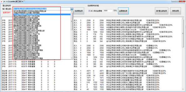 营业部检索,可以检索当日龙虎榜中出现该营业部的股票,支持同时检索同一只股票中的两家营业部,营业部以“|”分隔。也可以检索当日做T的营业部,即同时有买入,也有卖出的。