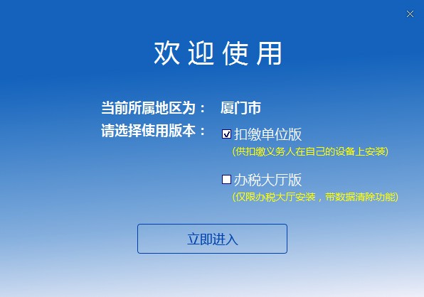 软件安装完成后,点击界面上的【立即体验】按钮(或点击桌面“自然人电子税务局(扣缴端)”快捷方式),进入版本选择界面。除了在办税大厅终端上部署的客户端选择“办税大厅版”外,其他均选择默认选项,即“扣缴单位版”。