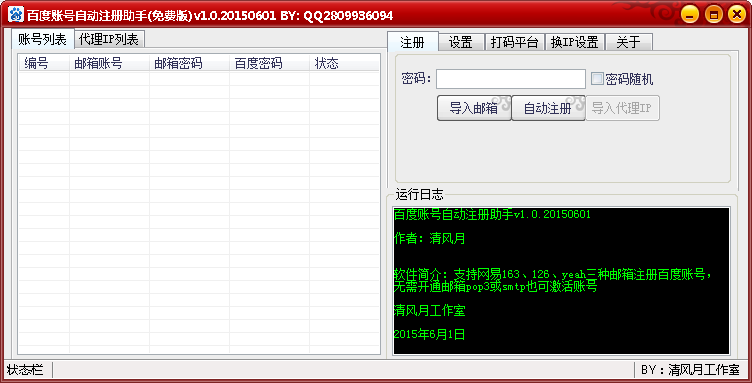 百度账号自动注册助手是一款由清风月工作室开发设计的工具,它小巧便捷,简单易用,为你自动批量注册百度账号,目前这款百度账号自动注册助手支持网易163、126、yeah三种邮箱注册百度账号,哪怕不需要开通邮箱pop3或smtp也可激活账号啦。