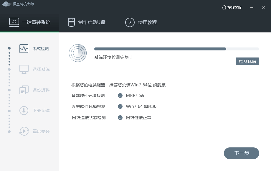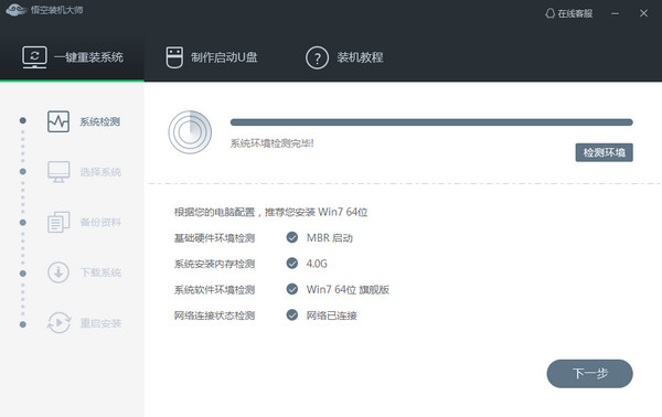 系统检测。下载软件完软件后正常打开(“”), 程序会默认检测当前系统环境,检测完成后,点击“下一步”。