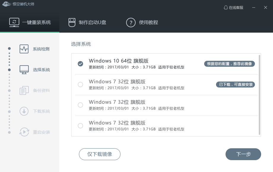 选择系统。深度装机大师已为您推荐适合电脑配置的系统版本,用户也可选择XP,Win7或Win10;无需任何操作,点击“下一步”。