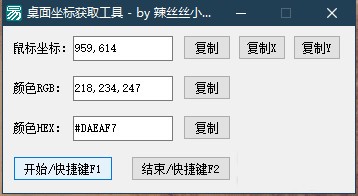 桌面坐标获取工具是一款非常好用的桌面坐标读取工具,通过鼠标的移动来获取当前点的坐标以及该点的RGB值,也能够很好的进行取色,适合脚本开发使用,有需要的用户不要错过了,赶快来下载吧!