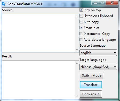 两种窗口模式可供选择,主模式及专注模式,专注模式只提供译文窗口,便于您关注结果。使用专注模式时注意勾选Stay on top及Listen clipbod,时应勾选Auto Copy。