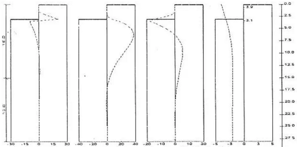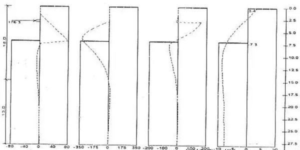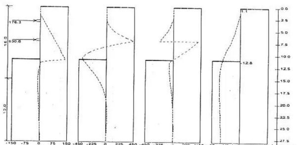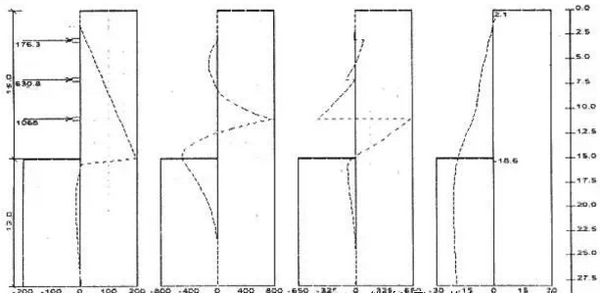在进行工程设计时,发现采用该软件计算和用增量法计算的结果相差较大。现用对以上工程按同样施工步骤进行计算。采用理正软件,用K法,基坑以下土压力按矩形分布模式(与增量法相同)计算。计算结果结果见图: