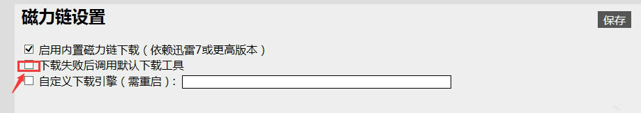 可在配置内置下载引擎拉取种子失败后是否传递给默认下载工具重新下载,默认关闭。
