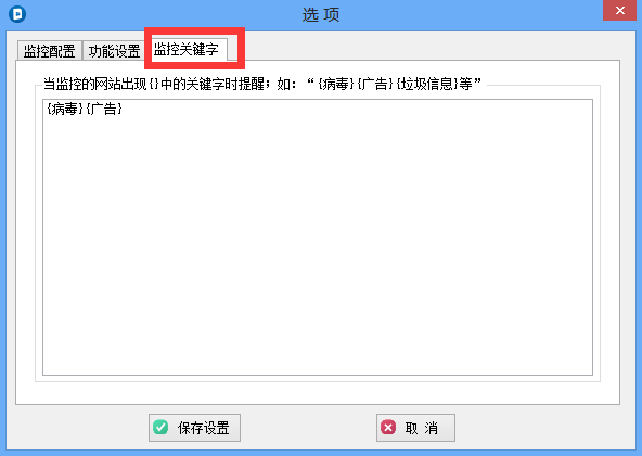 其次. 选项功能页面会出现三块大内容,首先说下被监控关键词的设置: