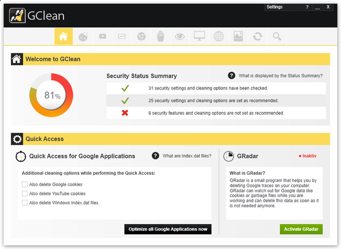 Abelssoft GClean是专为Windows系统制作的一套流氓软件清理工具,同时具备反间谍软件的功能,通过它,你可以直接关闭各种应用程序的网络连接,并清理掉这些应用的使用痕迹,这样可以在不删除的情况下,防止盗用信息,另外,GClean可以自动检查你所安装的所有程序,当发现有跟踪行为时,会发出警报,并自动清理。