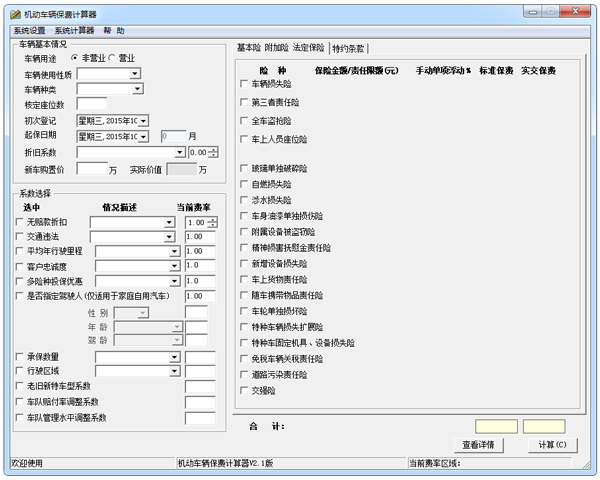 未注册版本采用保险公司的标准费率数据,有使用次数限制,不能计算盗抢险和车上人员责任险,不能修改费率,次数到限后 也可以计算部分险种保费。