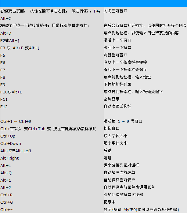 以下是MyIE蚂蚁浏览器的操作快捷键