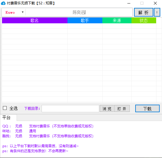 网易和酷狗不稳定所以没弄上来,QQ,咪咕,酷我这三个平台基本上垄断了收费音乐,所以有没有问题都不大,不过还是建议有条件的朋友支持一下正版!