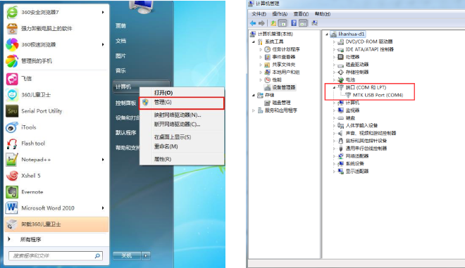 点击【开始】->右键点击【计算机】->点击【管理】,打开计算机管理,若设备管理器里没有MTK USB Port,驱动就不正常,如下图: