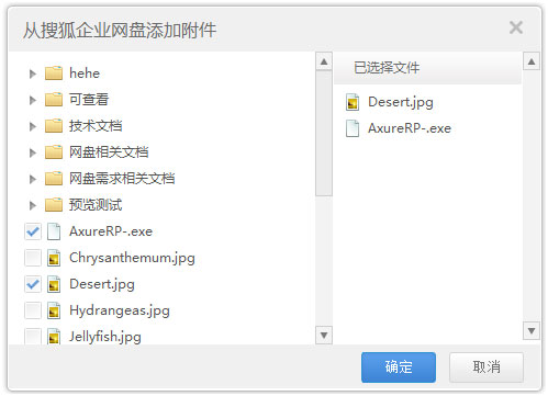 点击“从‘搜狐企业网盘’添加附件”,显示您网盘文件目录,从左侧选择要添加的文件即可。