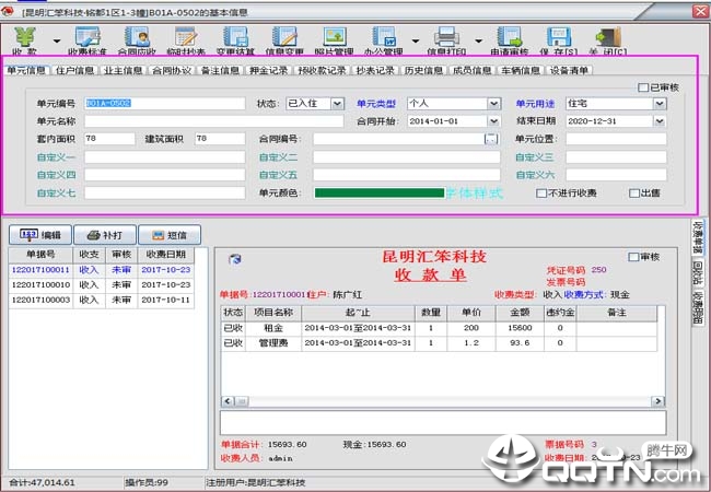 合同到期、费用到期等通过报表可以进行统计并打印出来,也可以单户打印出来通知商(住)户,另外还有更为便捷的手机通知,自定义设置预警的天数,自动发送手机短信进行通知。
