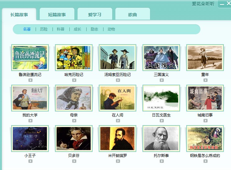 3.阅读名著,无论是从现在语文考试题型考虑,还是个人素养都是的。但是,经典名著往往不受喜爱。爱花朵听听,告别传统阅读模式,让名著用耳朵欣赏。收集国内外经典名著,鲁滨逊漂流记、四大名著等等。