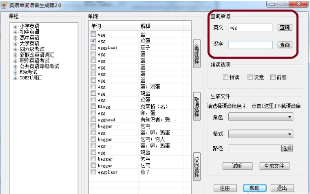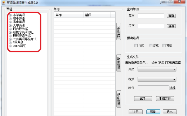 1、根据需求选择需要生成语音的英语单词,有小、初、高、大学课程选择