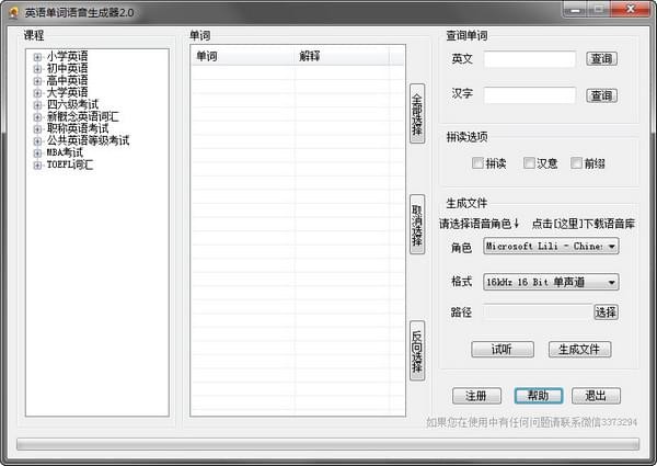 英语单词语音生成器是一个可以把英语单词发出读音,并能生成语音文件的软件,生成格式为wav,符合所有随身播放设备的格式,如、、多媒体手机、录音笔等等。软件的试听功能,可以帮助你校正发音不准的问题,本软件支持单词搜索,汉语翻译。