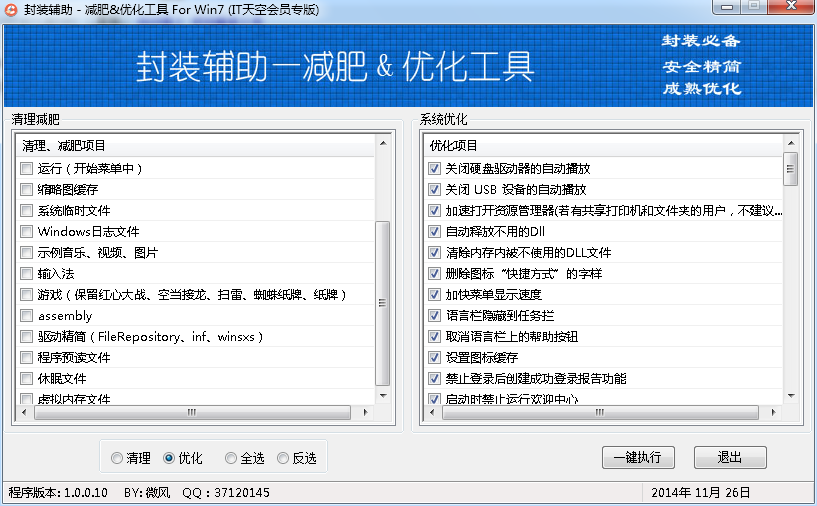这是由IT天空出品的一款系统辅助,专门用于windows7系统减肥清理优化工具。工具通过对系统的垃圾项进行清理减肥,同时对于系统配置进行优化,对win7系统超微精简处理和注册表优化设置。清理减肥17项,注册表优化79项。实现win7系统到达最优运行状态。