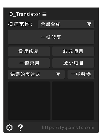 AE翻译官脚本可以一键自动修改这些表达式,将表达式里的英文属性名称(或效果名称)翻译成中文,从而修复这些AE表达式错误。不仅如此,AE翻译官脚本还支持修复其它各种常见的AE表达式错误,它会尽可能地帮你修复表达式,除了一些不可挽回的表达式错误。