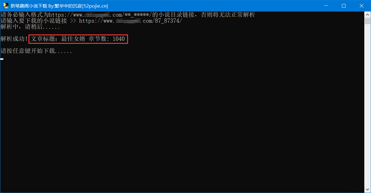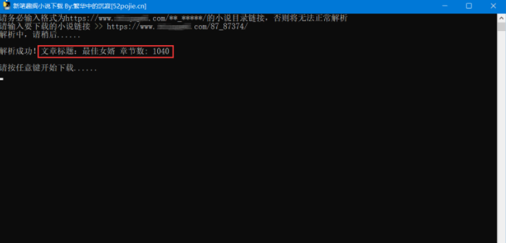 2、程序将会自动解析文章标题和总章节数,按下任意键开始下载