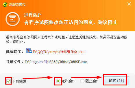 运行神马14号集成音乐盒后,360会拦截本工具联网,请允许