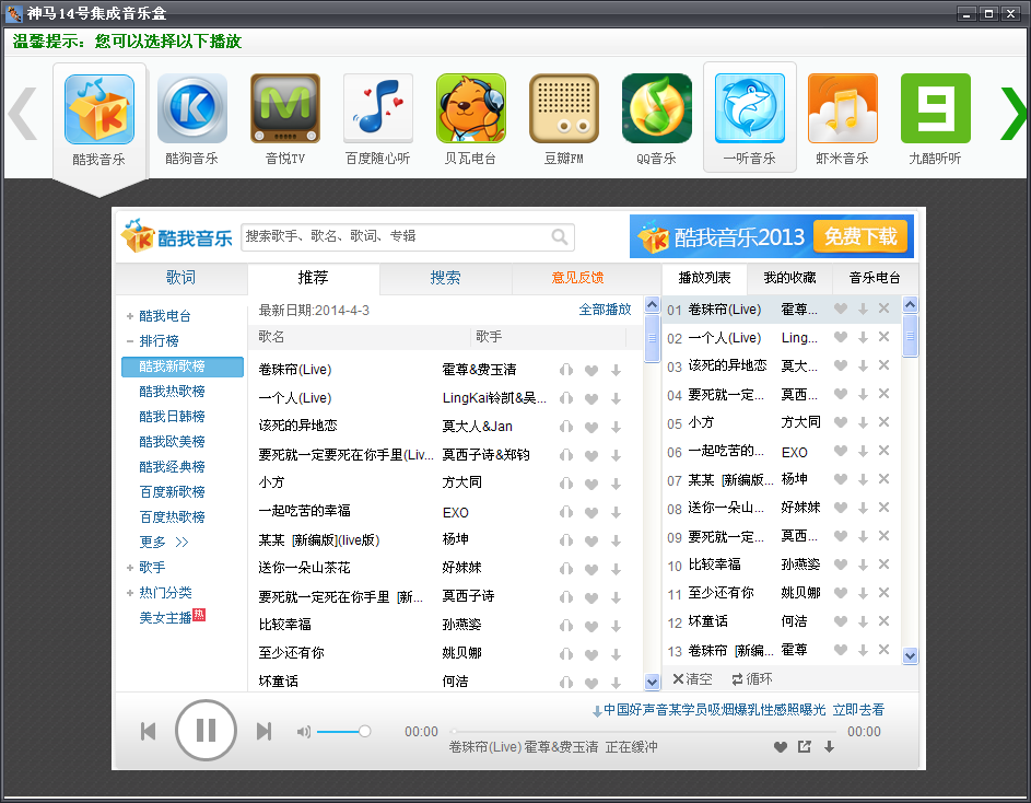 ,酷狗音乐,一听音乐,音乐TV,百度随心听,虾米音乐,贝瓦音台,豆瓣FM,QQ音乐,多米音乐。九酷听听,虾米电台,酷我电台等13个音乐集成