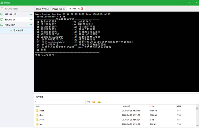 堡塔终端是一款同时支持SSH和S的免费软件,你可以在同屏切换SSH和SFTP界面,使用命令行的同时还可以快速上传或下载文件,非常方便,SH终端管理以及文件传输合二为一,操作更方便,工作更高效!