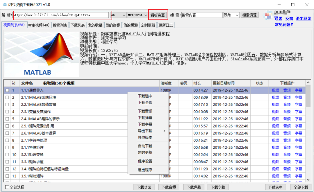 软件很实用,将你需要下载的视频链接复制到软件上解析后,会显示该套视频的标题、作者、介绍……
