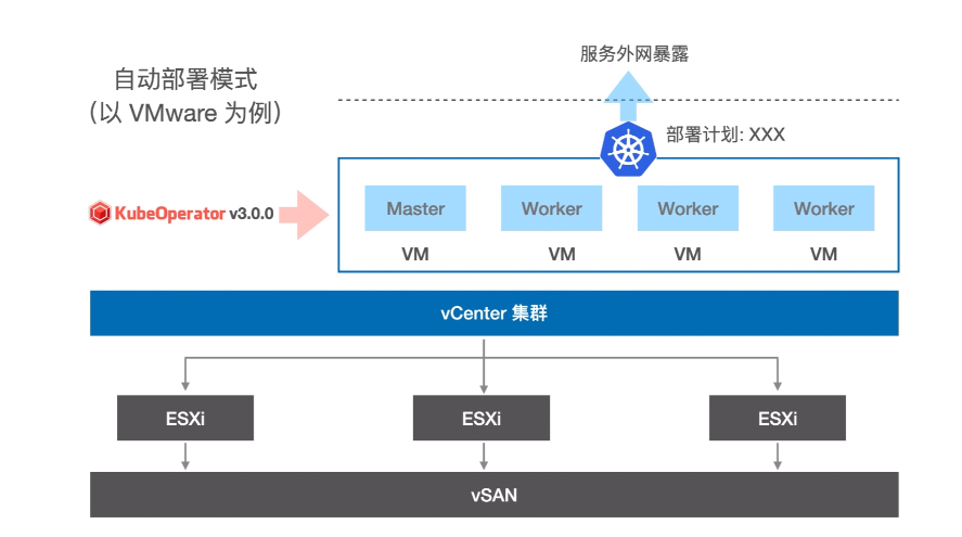 KubeOperator 使用 Terraform 在 IaaS 平台上自动创建主机(用户也可以自行准备主机,比如物理机或者虚机),通过 Ansible 完成自动化部署和变更操作,支持 Kubernetes 集群 从 Day 0 规划,到 Day 1 部署,到 Day 2 运营的全生命周期管理。
