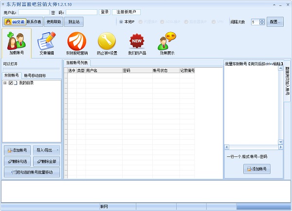 石青东方财富股吧营销大师是一款高效东方财富股吧工具,可以全自动在单个股票吧中做全能营销。本软件是一款全自动的东方财富股吧,包含帐号管理、内容采集、股票采集、涨跌停计算、停牌采集、金融信息发、sina微博连带发送、股吧回帖,等等不同功能。自动换IP,可以使用ADSL模式,代理模式,路由器换IP模式,操作简单。