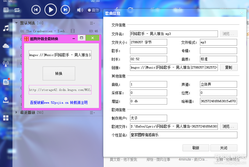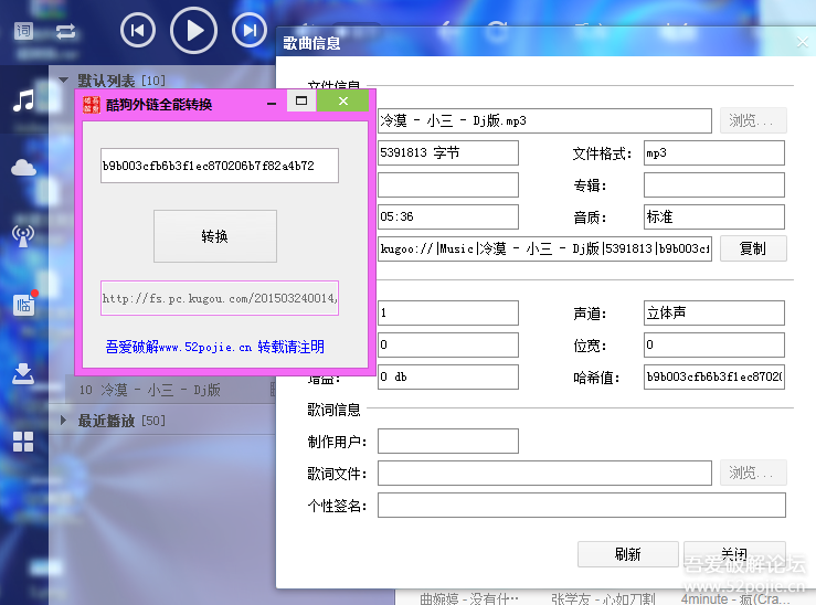 有时候在上听到好听的歌曲想分享给朋友,但是却无法使用酷狗外链,怎么办呢?没关系,今天小编为大家带来酷狗外链全能转换,它是一款强大的酷狗音乐外链转换器,这款软件无需调用外部网站就可以轻松对酷狗的链接转化成空间或者论坛可用的外链,支持支持哈希值,酷狗歌曲信息上的链接和网页酷狗的分享链接。